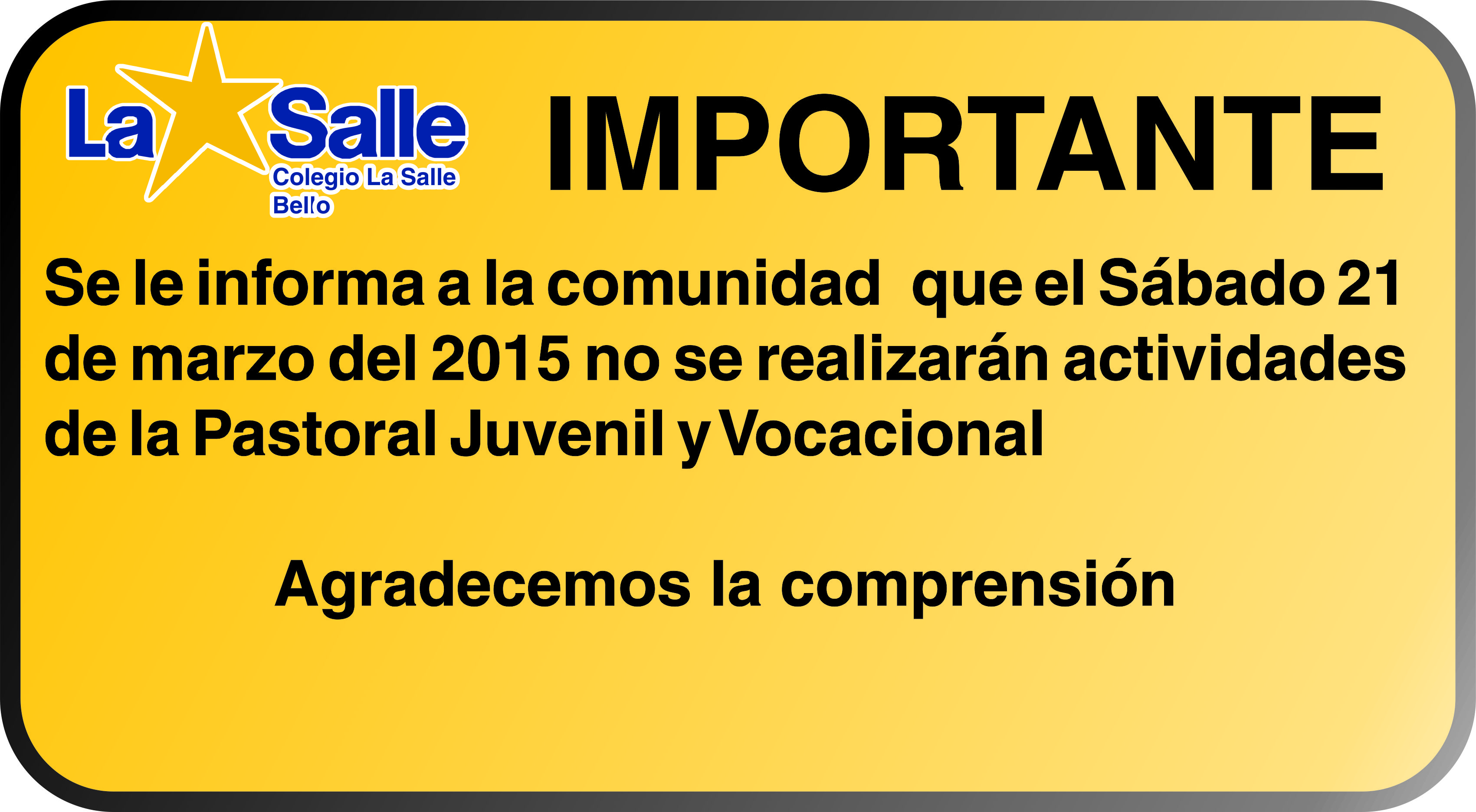 El Colegio La Salle Bello realizó el 27 de marzo su tradicional Inauguración Deportiva, actividad donde nuestros estudiantes demuestran su creatividad y compañerismo. Este año la temática de la actividad fue la Copa América de Chile. Los estudiantes realizaron porras alusivas al deporte, al compañerismo y juego limpio en esta edición de los juegos interclases.