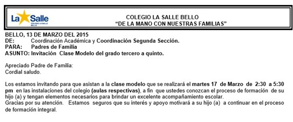 Circular num. 9 Invitación Clase Modelo del grado tercero a quinto. para ampliar información de click en la imagen.