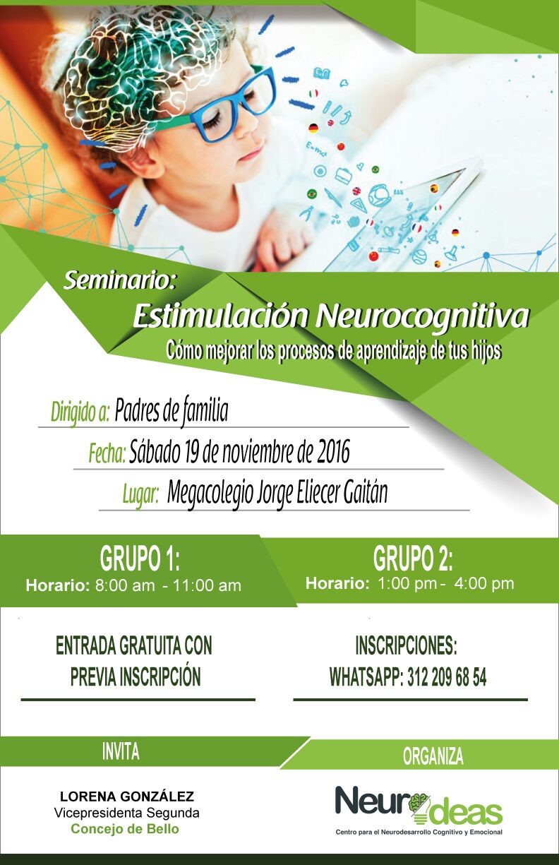 Neuro Ideas tiene el gusto de invitarlos al seminario Estimulación Cognitiva que se realizará el sábado 19 de noviembre de 2016 en el Megacolegio Jorge Eliécer Gaitan, realice su inscripción dando clic en la imagen.