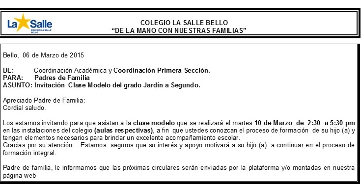 Circular num. 8 Invitación Clase Modelo del grado Jardín a Segundo. para ampliar información de click en la imagen.