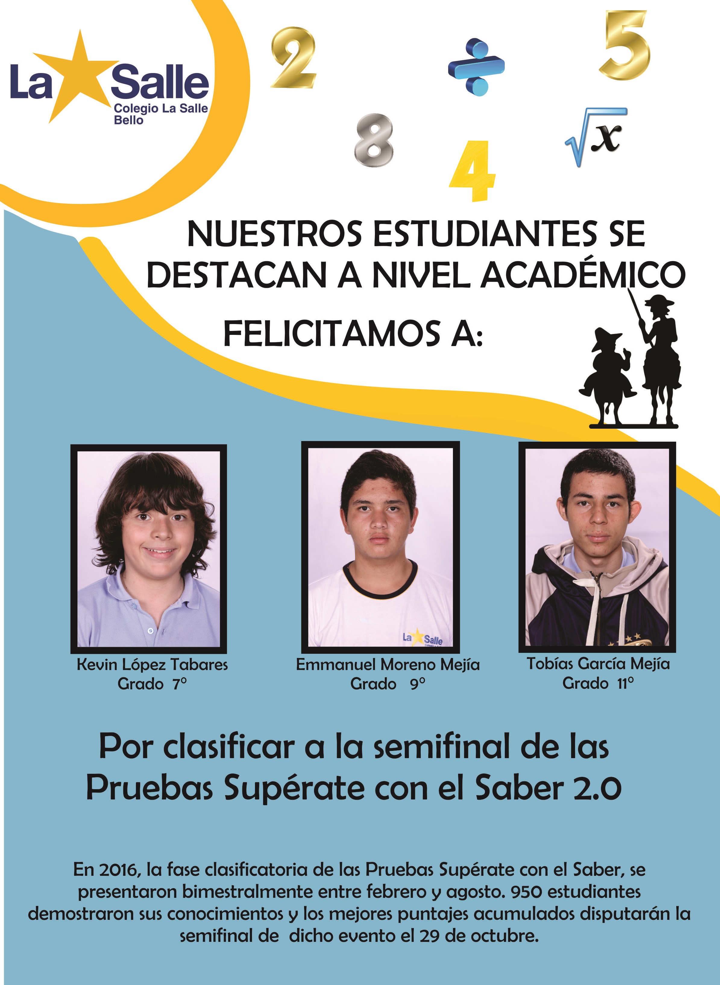 El Colegio La Salle Bello se ubica como el segundo mejor colegio del Municipio, según los resultado de las Pruebas Saberr 11 de 2016.