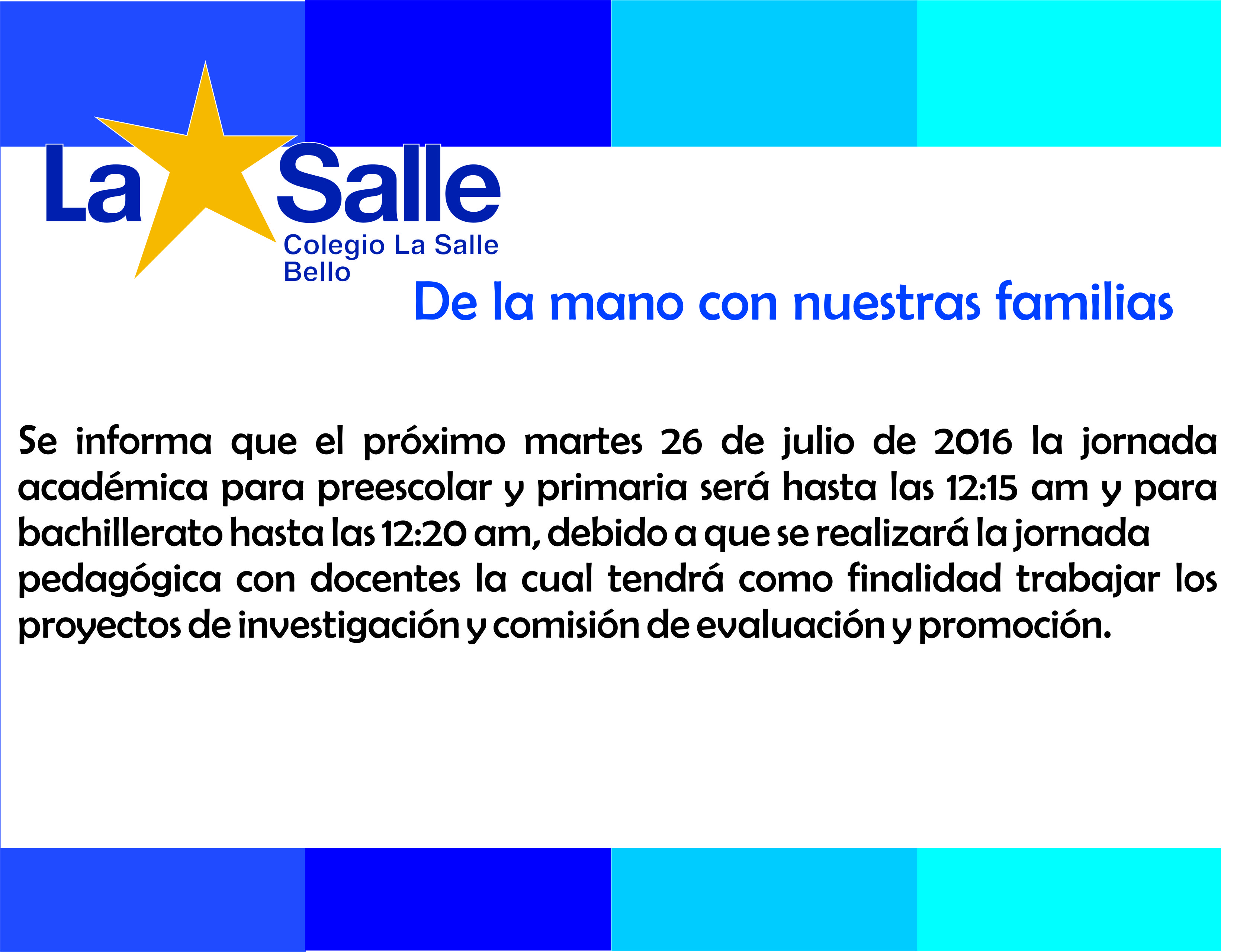 Con motivo de la conmemoración del 20 de julio, el Colegio la Salle Bello realizó un acto cívico, el tema principal fue la paz. Como actividad inicial el capellán Juan Camilo Puerta realizó la oración por la paz, como acto seguido el rector Eliécer de Hoyos Manjarrez se dirigió a la comunidad educativa e invitó a reflexionar acerca de la importancia de la paz en todos los contextos.